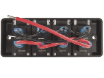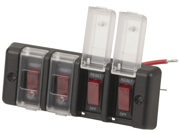 This switch bank consists of a gang of 4 x 16A/12VDC circuit breaker rocker switches pre-wired with protective translucent panels to discourage naughty fingers tampering with them. The rockers act like switches but will behave like a circuit breaker if any circuit pulls more than 16A. They would typically be used to power all sorts of things while under way which should not be turned off. Each translucent panel has a recess to accept a permanent sticker annunciating the function of the switch. A sheet of decal annunciators is supplied with 45 (yes 45) labels. These range from “Bilge Pump” to “Deck Wash”, to “Fridge”, “Macerator Pump”, “Radar”, “VHF”, etc. Approx. 40mm is needed behind the panel for wiring access. 2 x No. 8 countersunk screws are supplied.