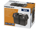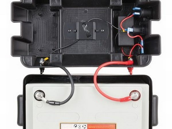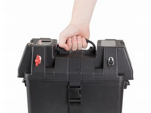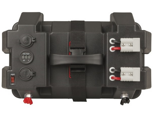 This portable 12V battery box has all the common connections you would typically need for your outdoor recreation power needs. The box with carry handles is capable of holding a deep cycle battery up to 105Ah (sold separately) which secures in place with the supplied webbing strap. High current power connectors include two 50A Anderson, insulated bolt terminals (wing nut), and a 12V cigarette lighter socket with over current protection. There is also a dual-port USB to charge your Smartphone and similar USB devices and a voltmeter to help monitor the battery level.
